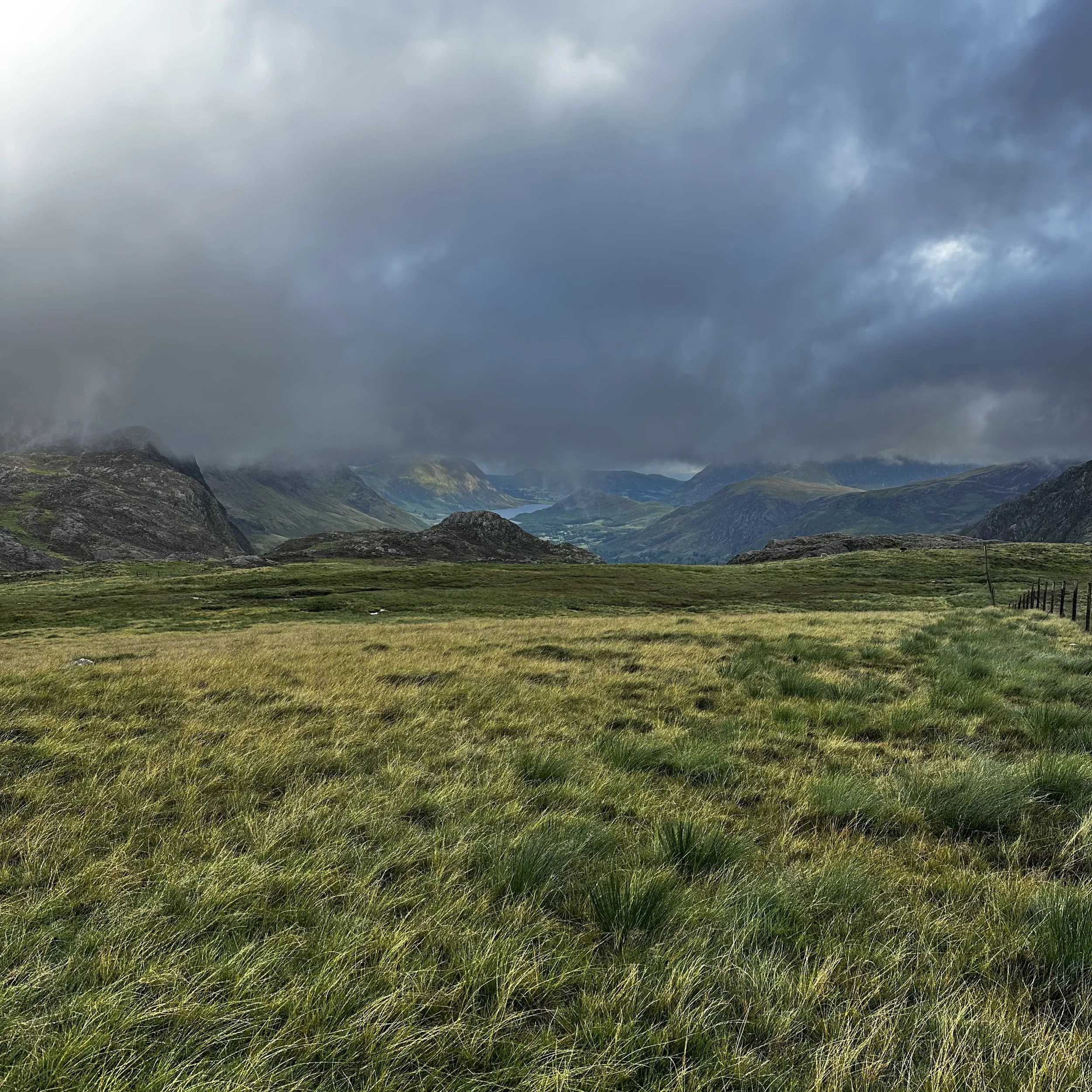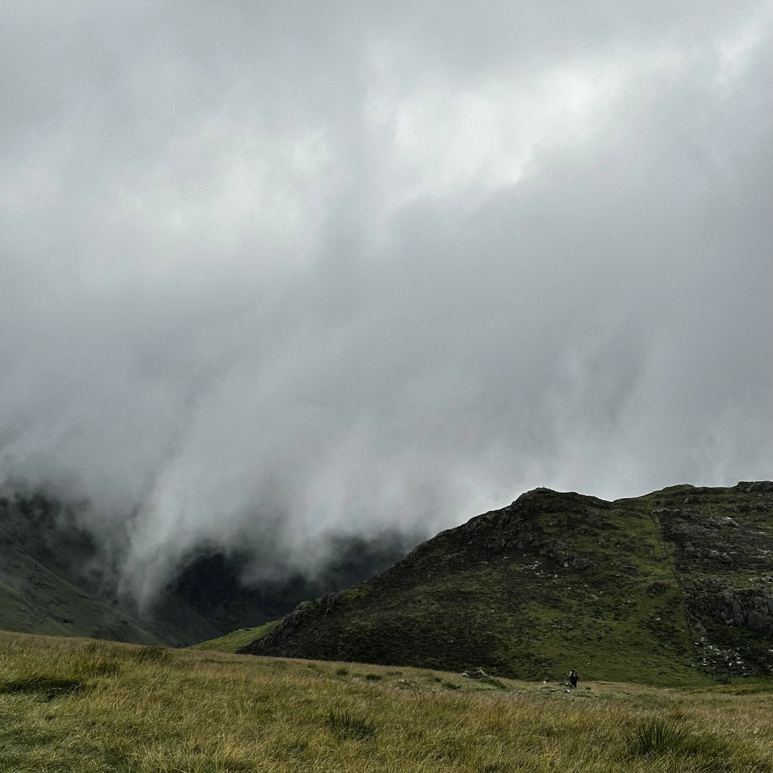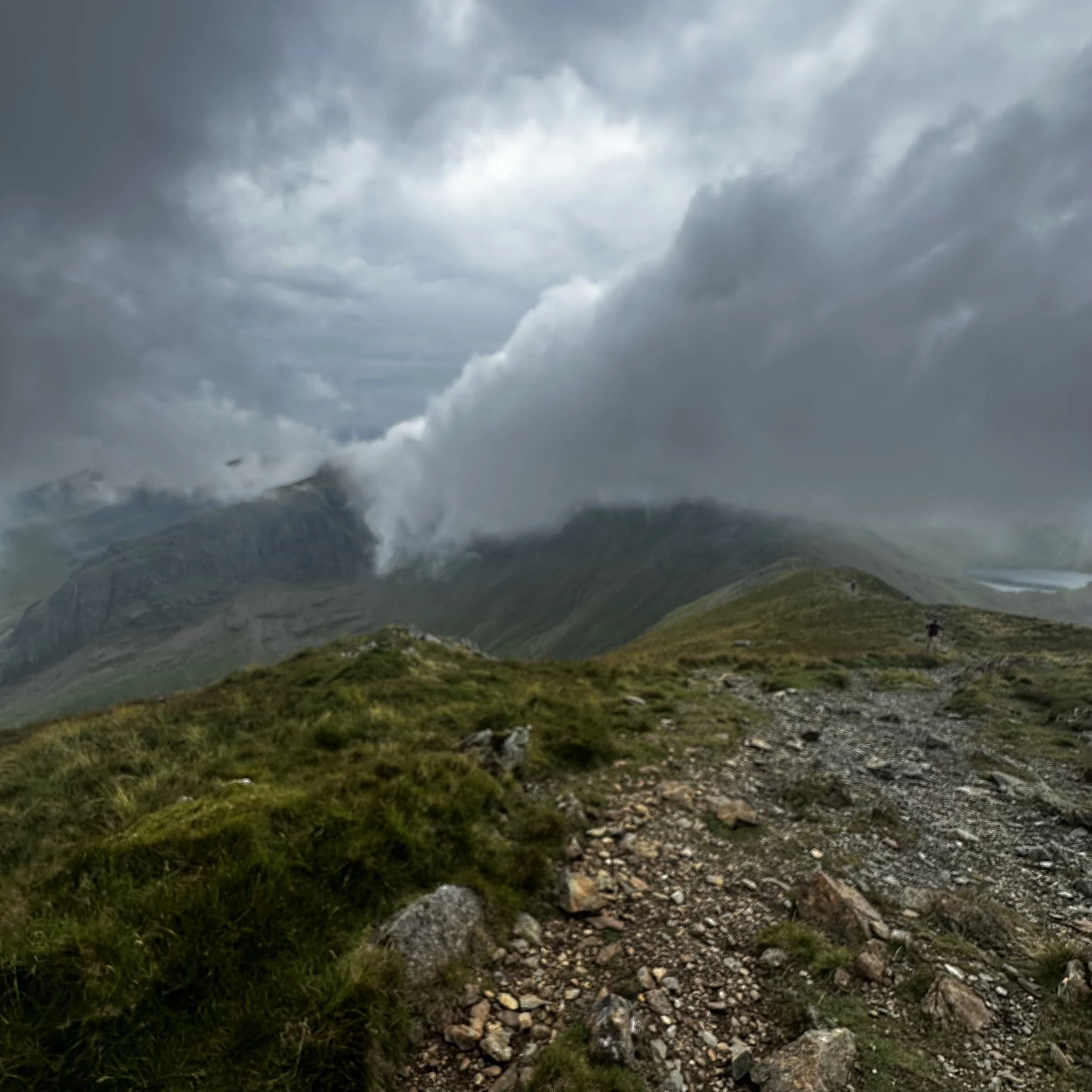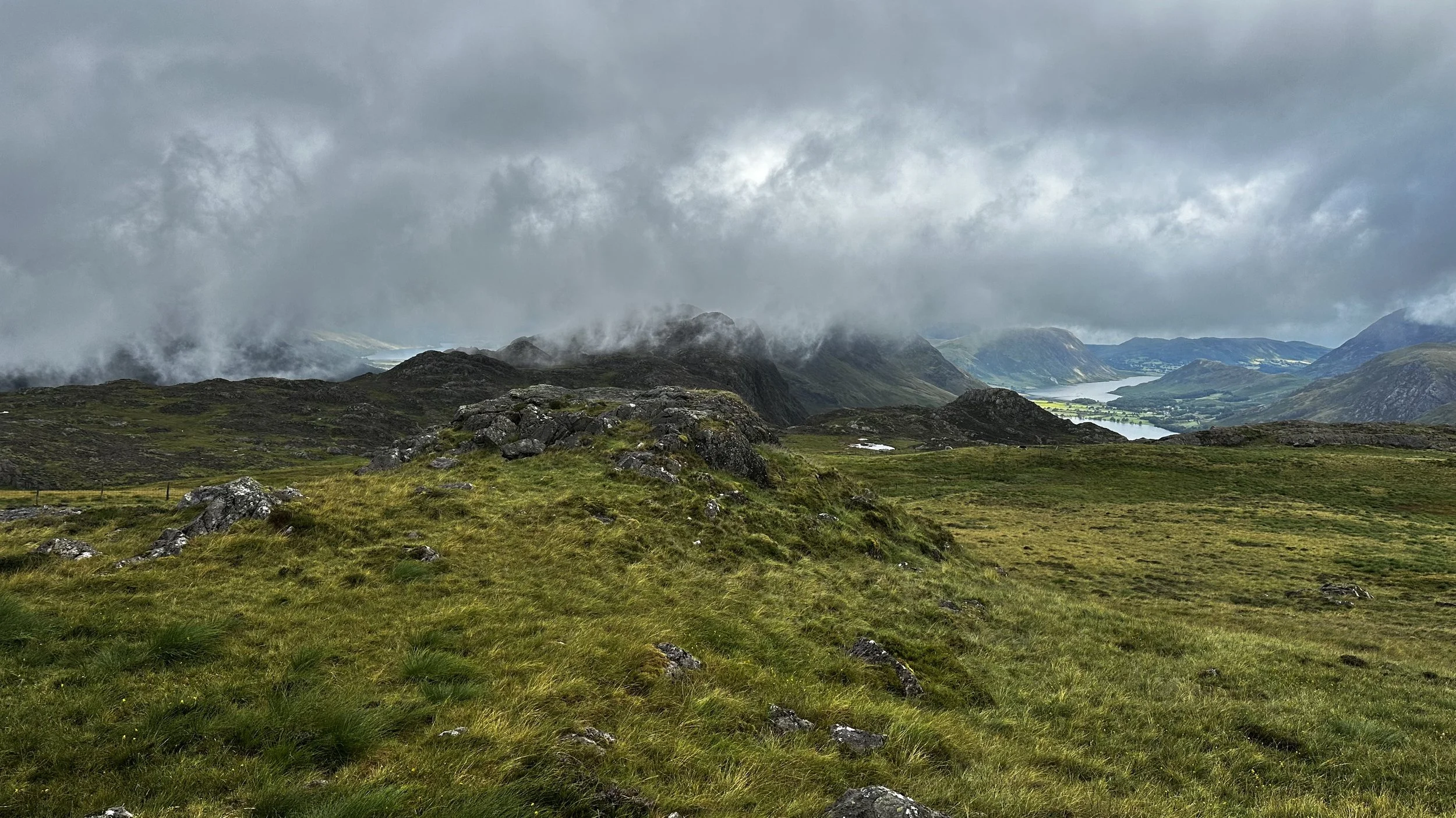 After 45 minutes tough slog we crested the first top, chased behind by clouds and enticed onwards by the promise of Lakeland vistas, who teased us for the next ten minutes between swirling mists and battleship grey clouds. Lake Buttermere and Ennerdale Water could both briefly be seen, linked by High Style, with distant St Bees Head – or possibly Whitehaven (begrudgingly) visible in the distance.