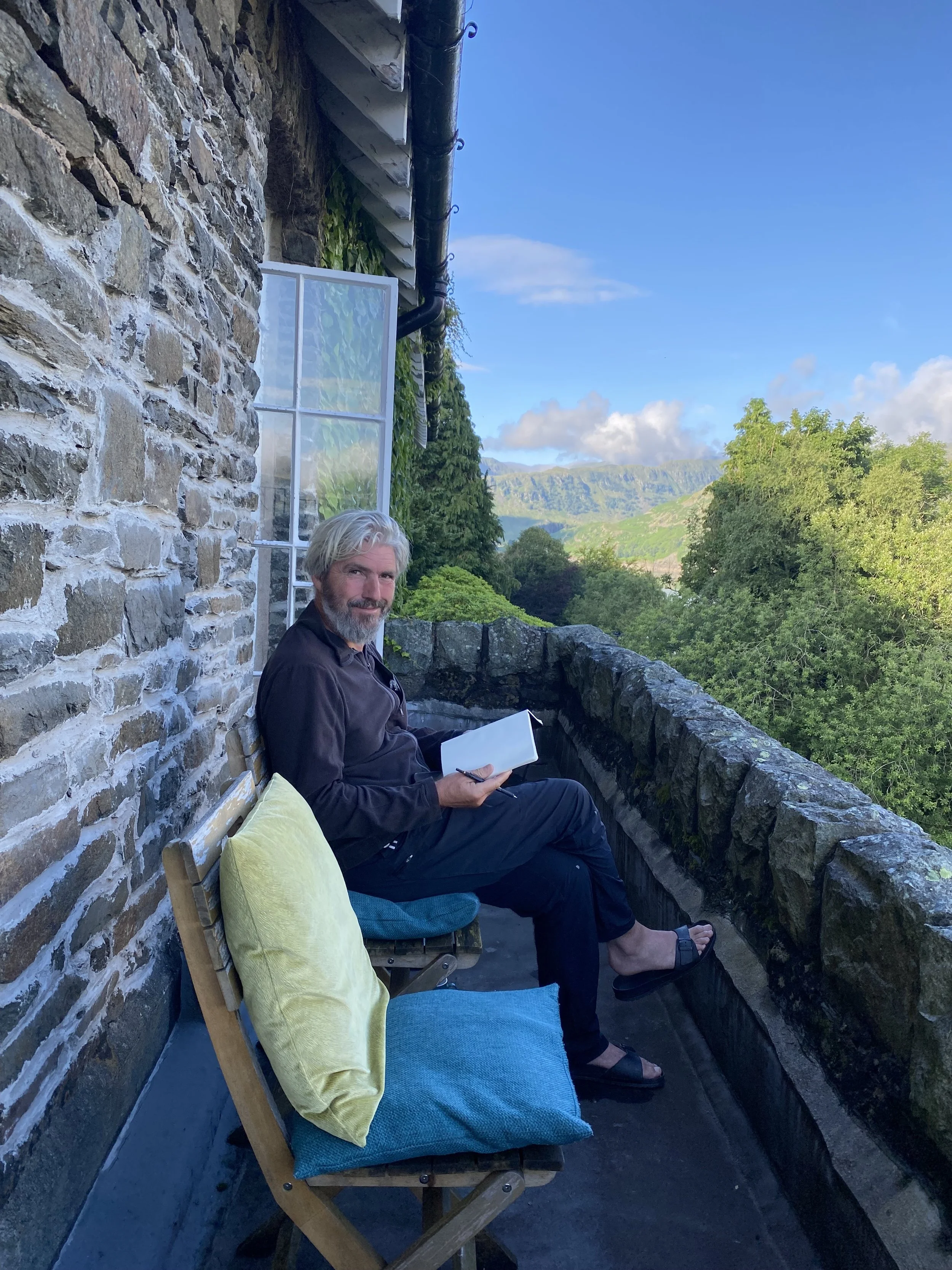 The crisp light of the first hours of day have their own beguiling lucidity and when combined with the hazy reflections on the water’s surface of trees, mountains and clouds, the delight is doubled. I asked Esther to join me, to take in the views and together we read, drank black coffee, listened to the singing of the birds, and watched the shifting shadows of the clouds. And so to breakfast.