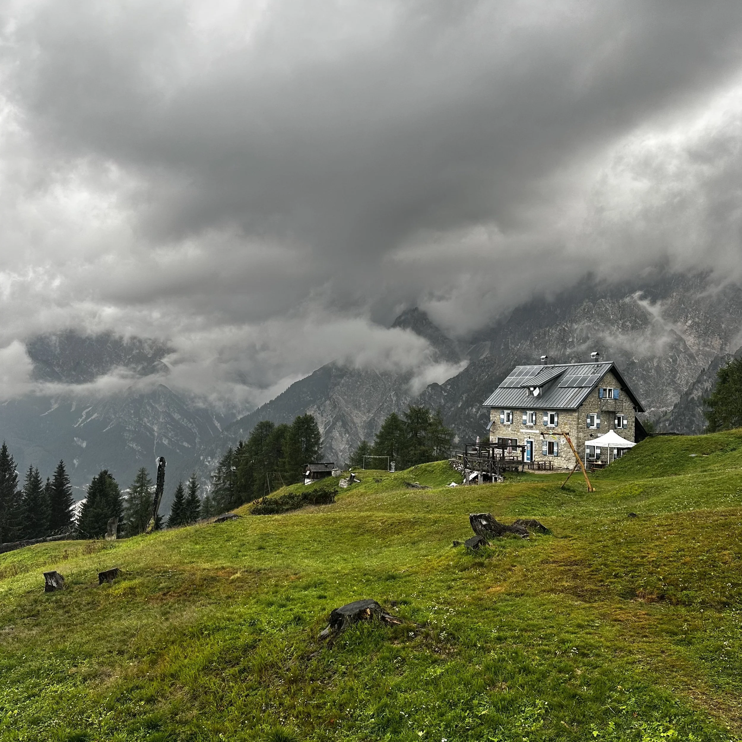 After two full hours of grunts and groans, we eventually saw the welcome grey roof line of our Rifugio come to view – obscured by the heavy rain which had replaced the midday sunshine and made the pathway just a little bit more treacherous and gave us another reason to feel even more sorry for ourselves.