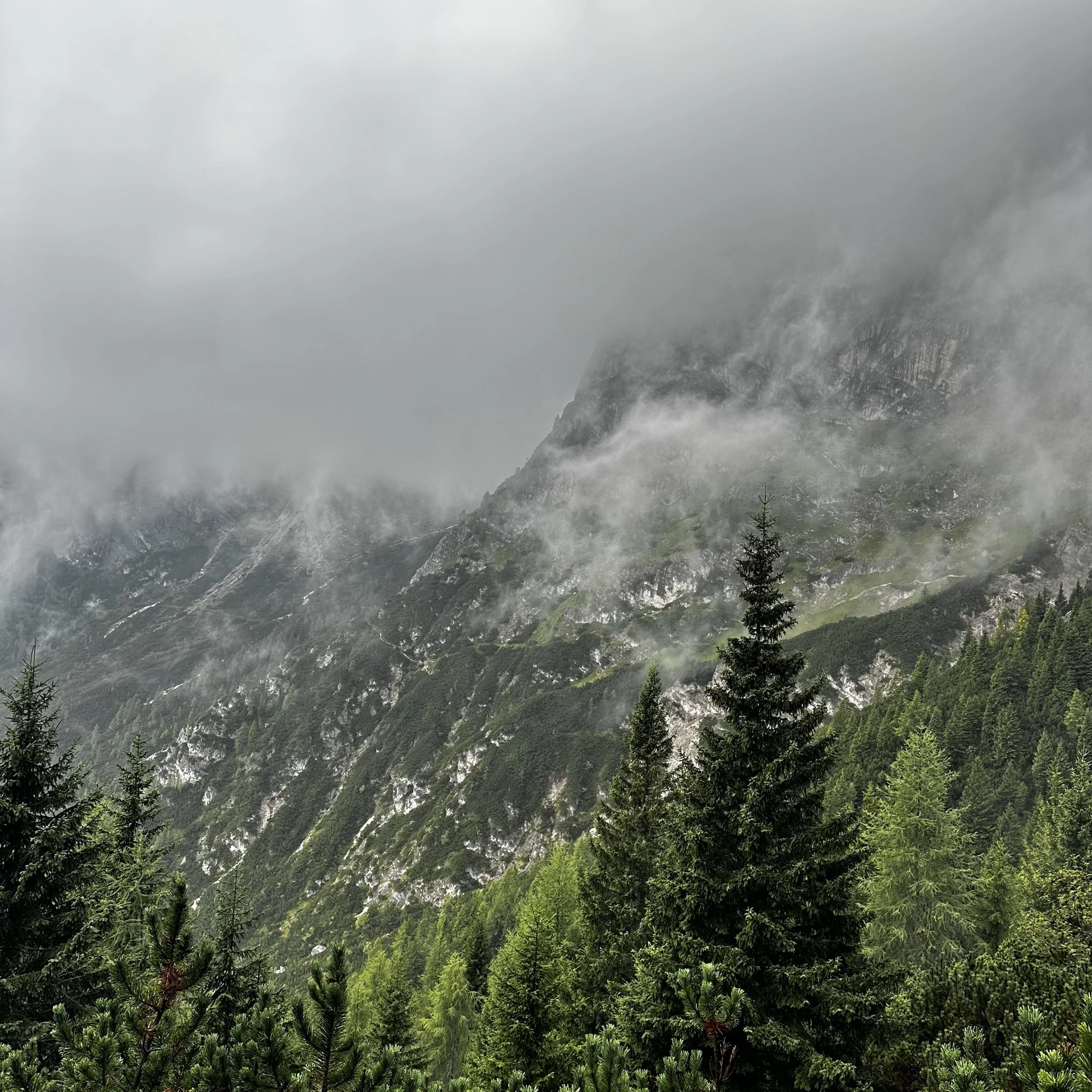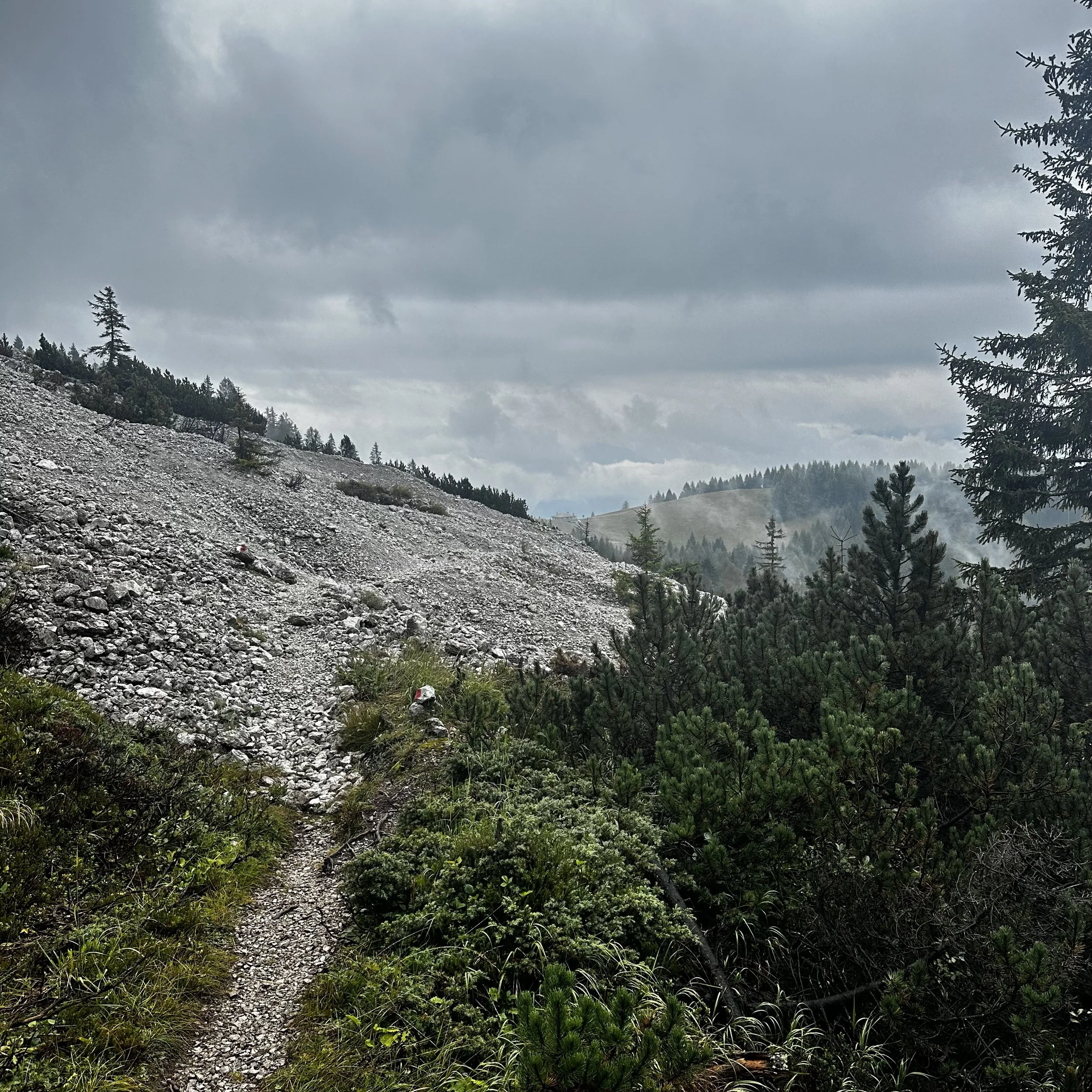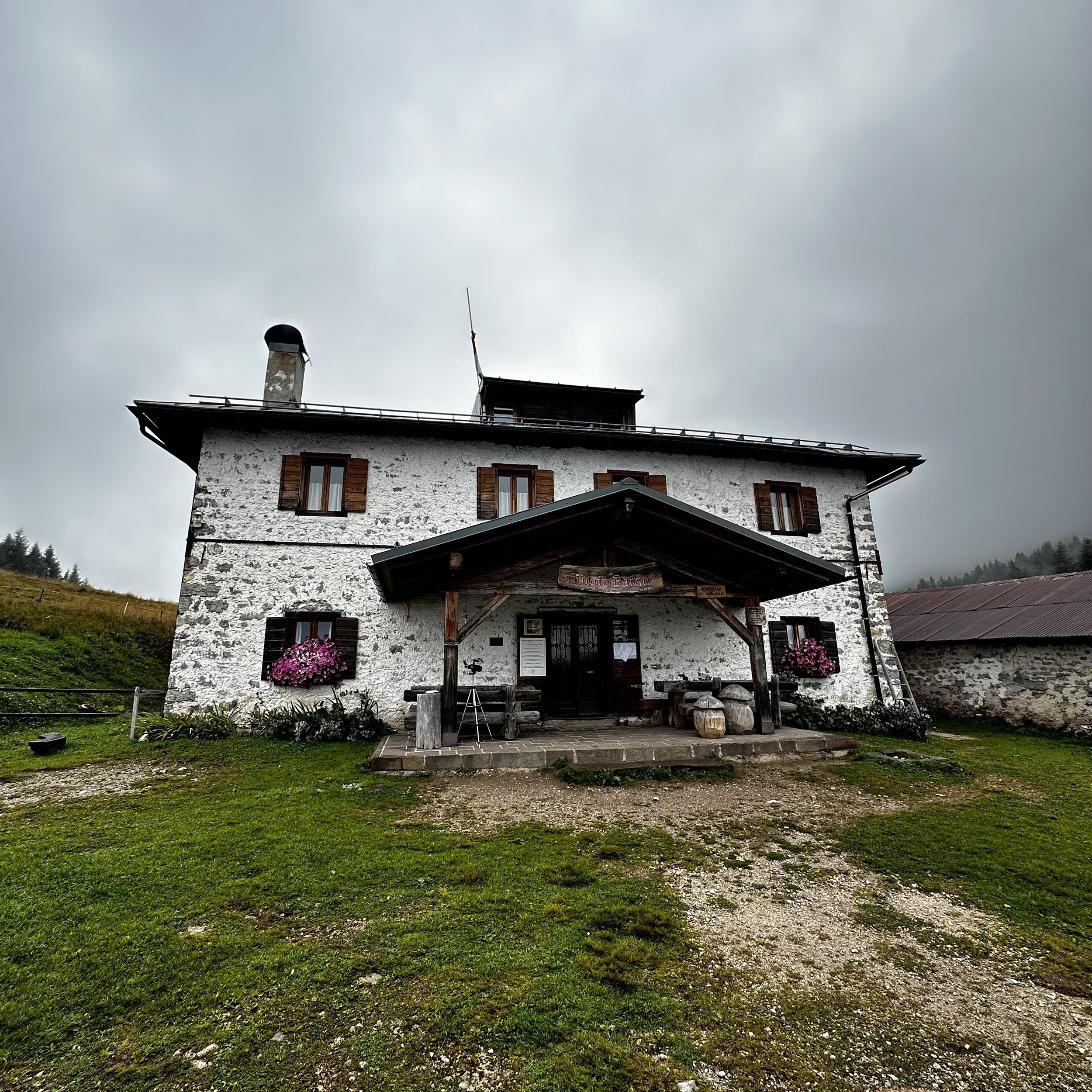 The last stretch towards Rifugio Baion was thankfully a simple woodland path punctuated with brief mountain views but mainly panoramas of cloud and mist.