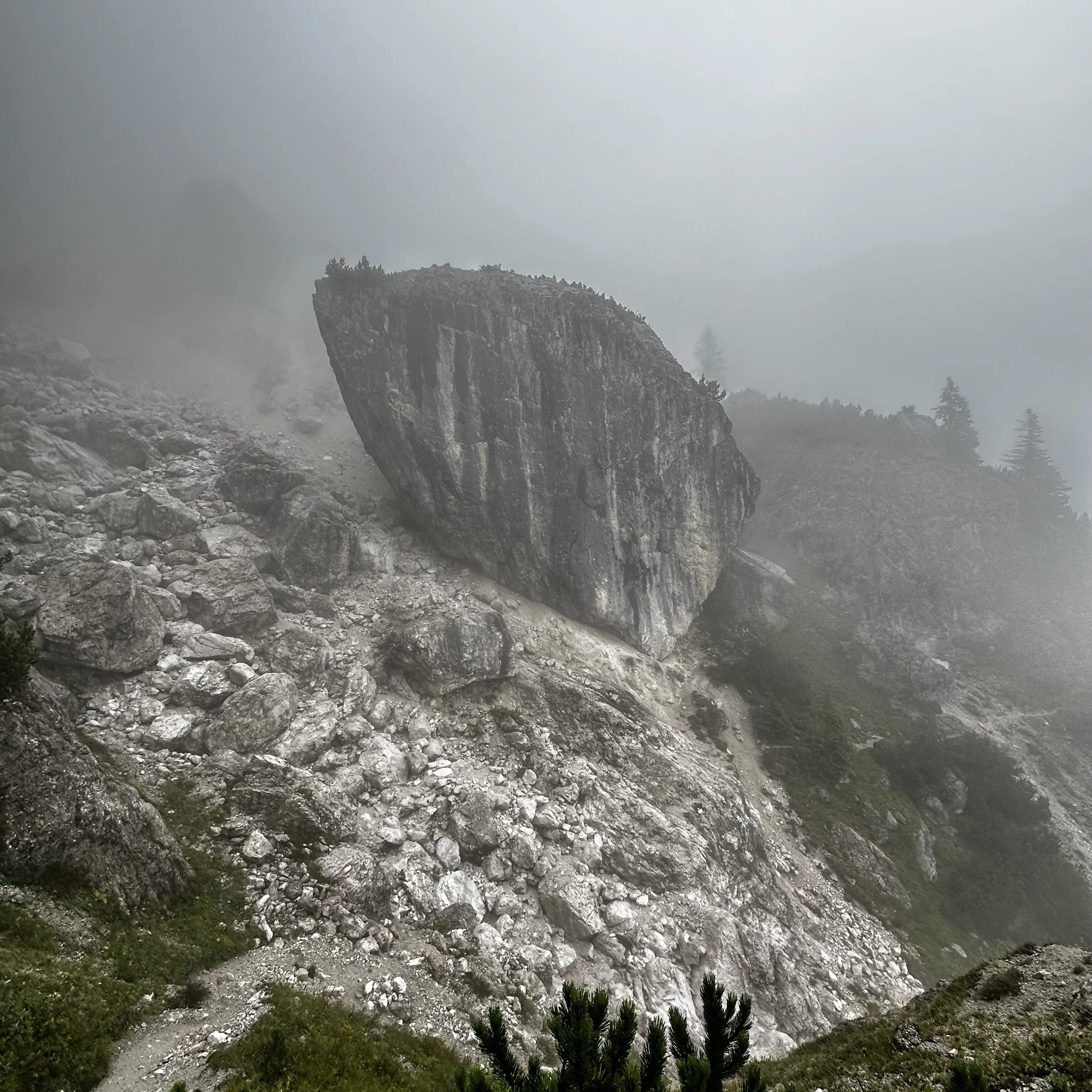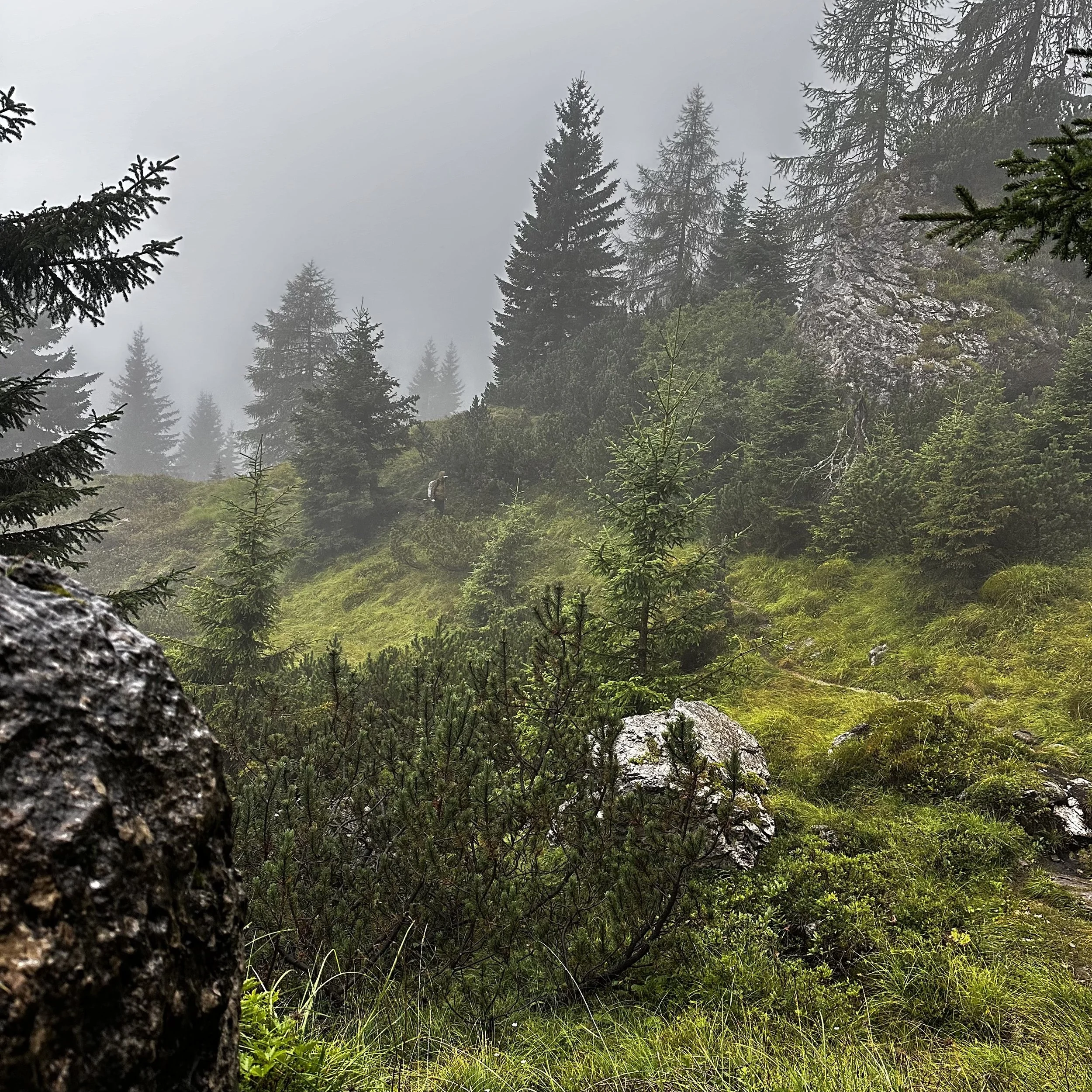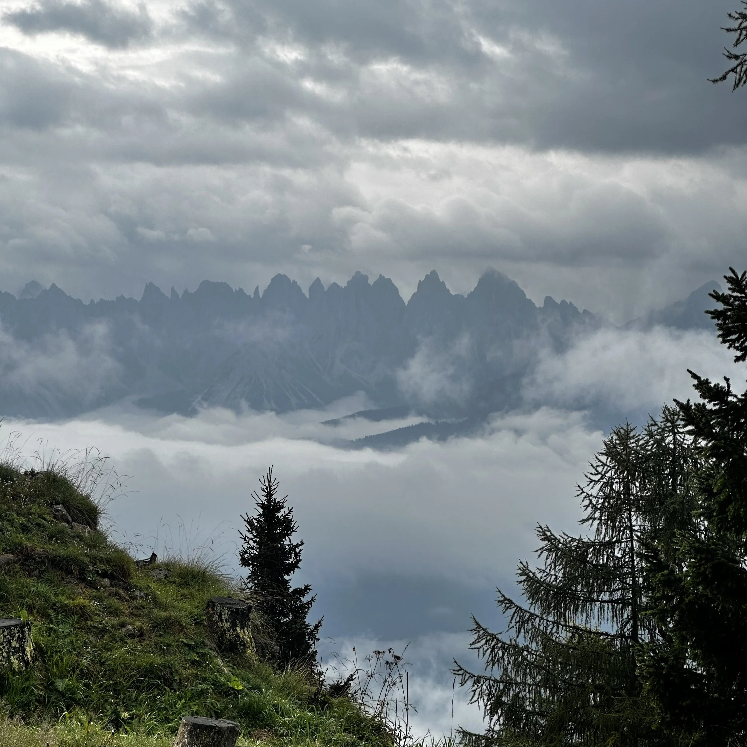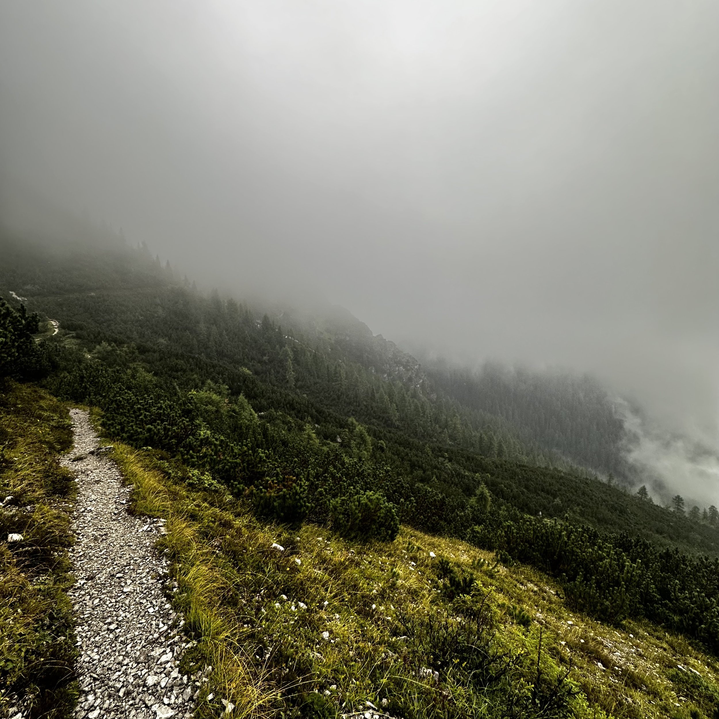 The last stretch towards Rifugio Baion was thankfully a simple woodland path punctuated with brief mountain views but mainly panoramas of cloud and mist.