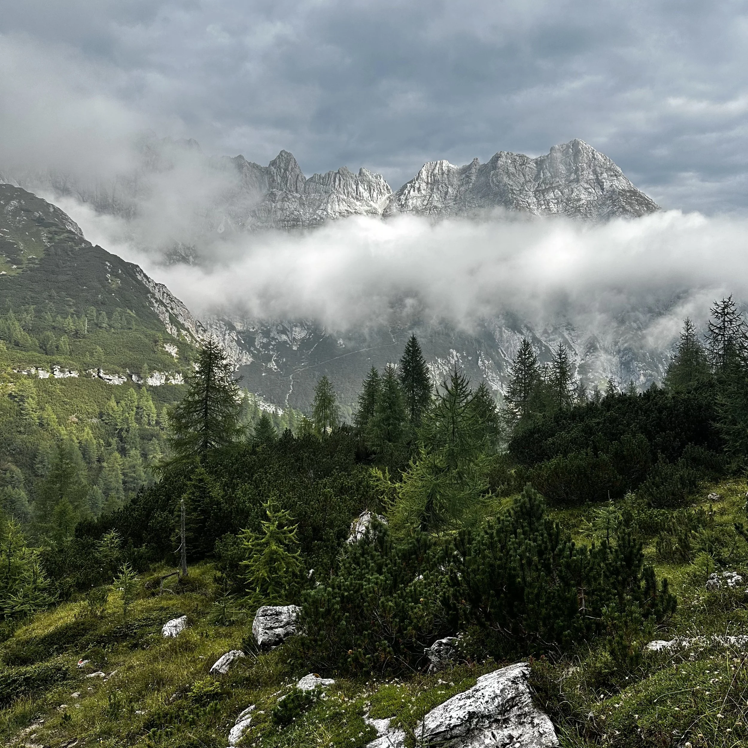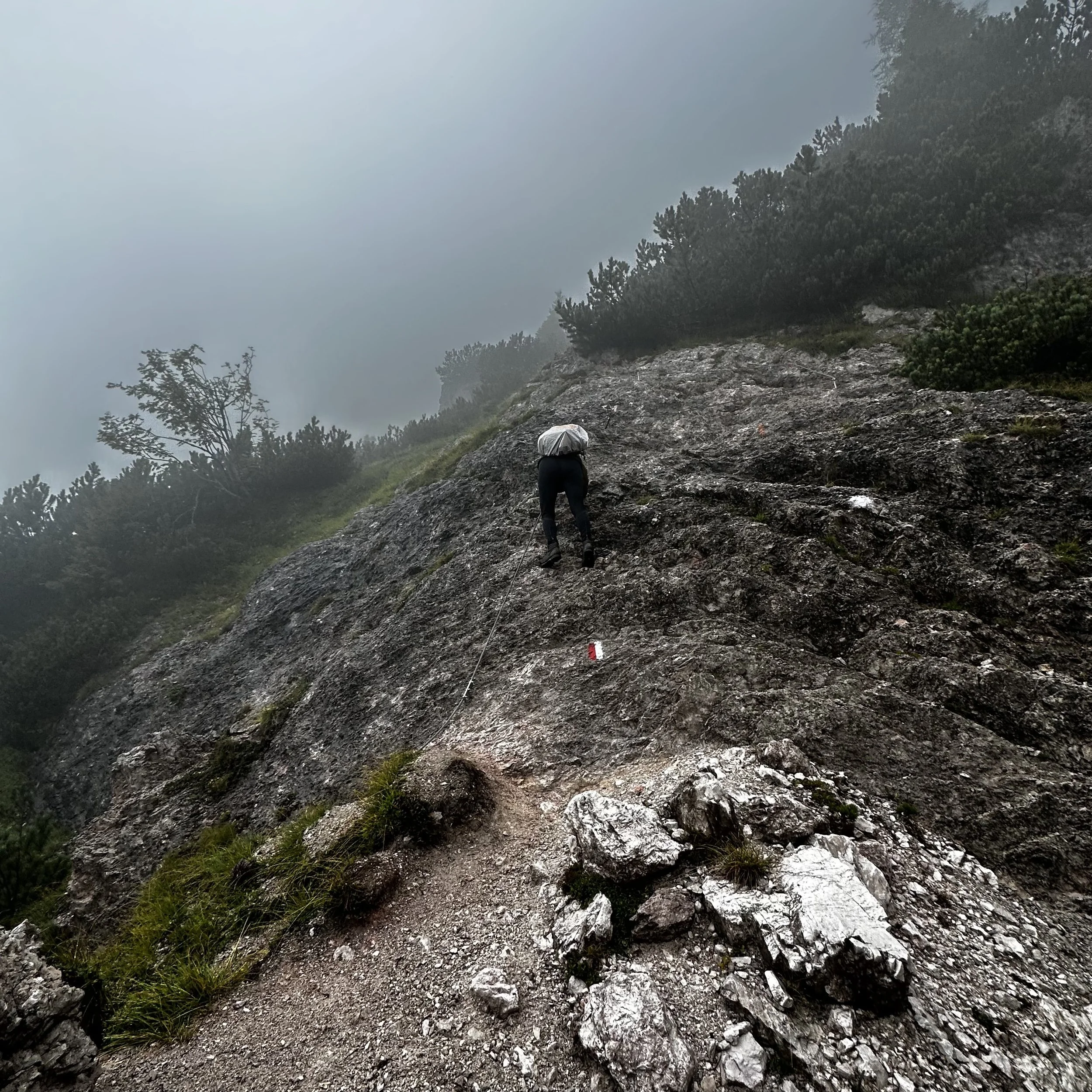 The first section was a steady climb through tree line pathways along the side of a mountain pass, part of the Monte Antelao massif. After an hour the path split, providing two options for our route around the first headland, which Esther explained to me as being the raven or the moose head routes.